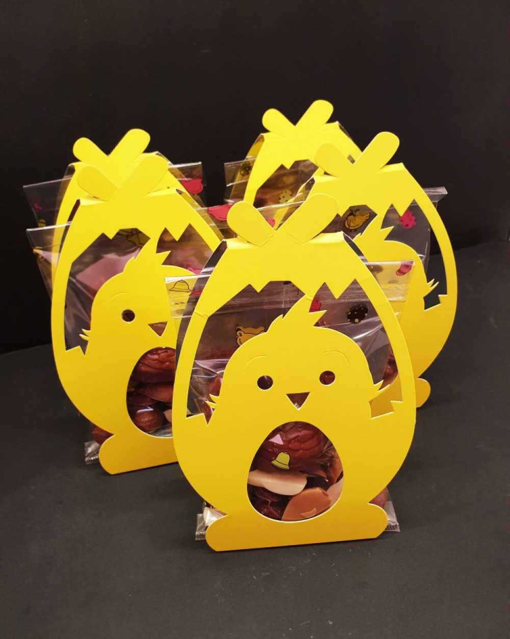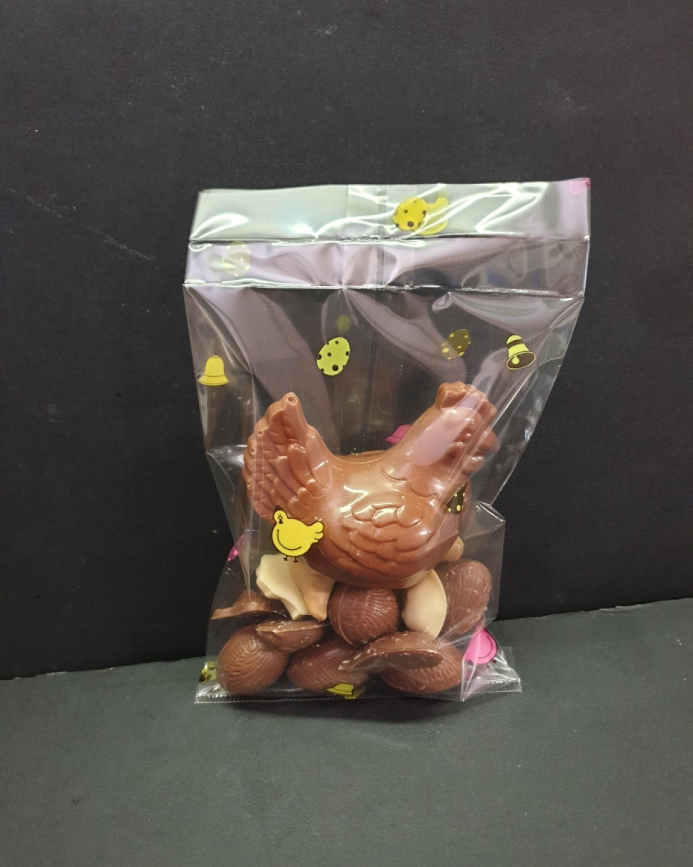 Compo composée d'une petite poule (chocolat au lait), de fritures assorties et d'oeufs praliné.