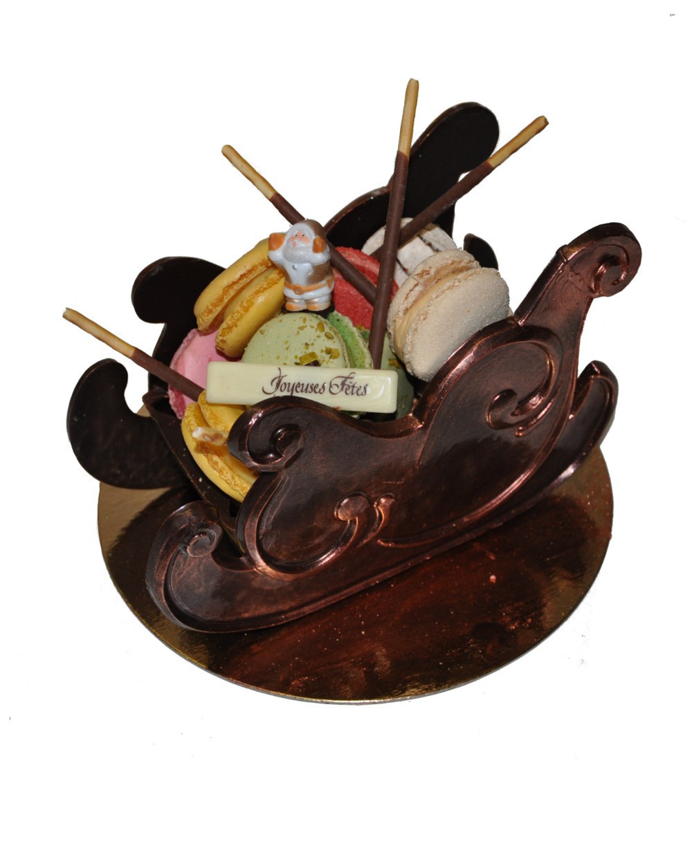 Traîneau de Noël en chocolat, garni de 15 macarons assortis.
